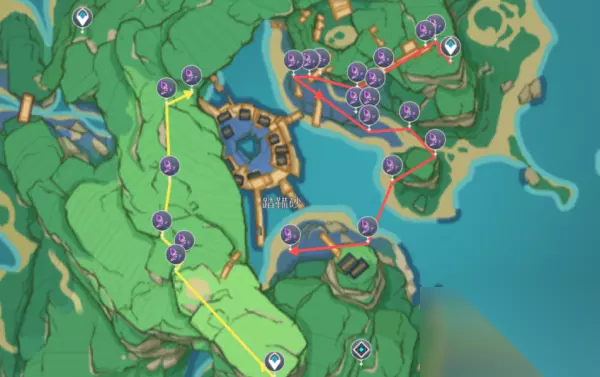 这里是鸣草最多的地方,有两条路线,红色的基本是在最下面,黄色是最上面。 众所周知,这里全是雷祸,所以大家采集的时候尽量带着雷种子和奶,这里推荐芭芭拉(纯奶终于站起来了吗)。 四、绯木村