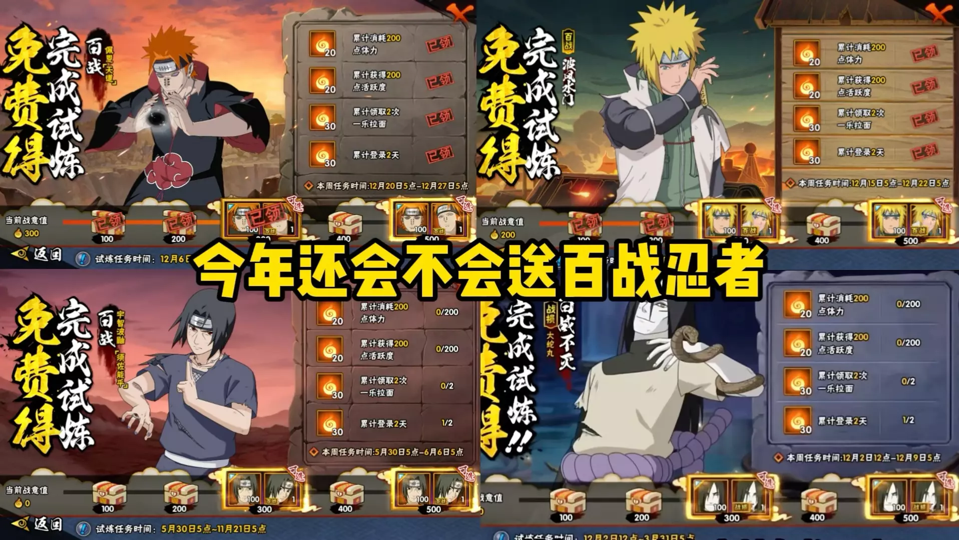火影忍者手游上线类似百战试炼的新活动,完成消耗体力、积累活跃度等任务获取羁绊值,最快23天、保底30天可兑换百战佩恩整卡,奖励模块替换为高招卷,百战虎皮预计12月上线。