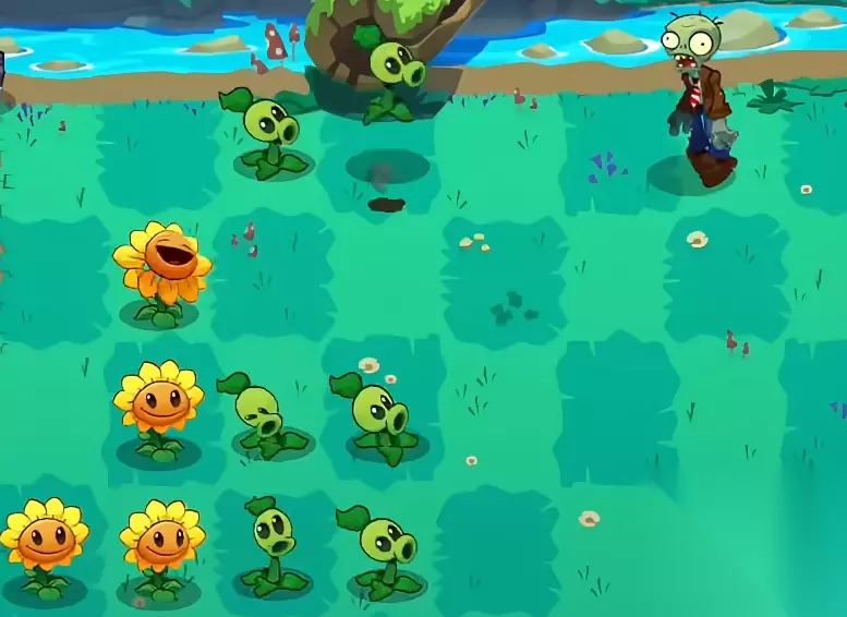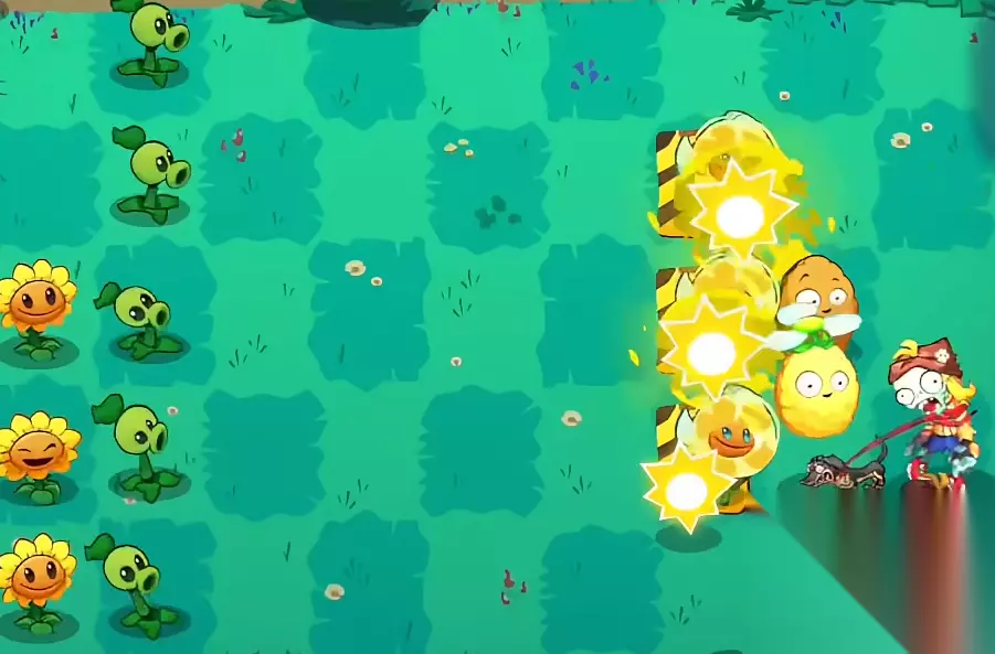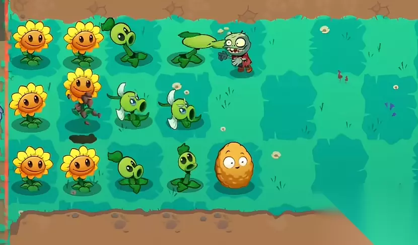 一开始我们需要在后面一排种植向日葵来收集阳光,之后除了最后一排以外都需要种上豌豆射手,其中尤其是第二行的敌人出现的是格外多,所以建议在前方的位置放置坚果,然后在第二行中间的位置来放置一个吹风草,这样咱们承受的压力会小上不少。等到压力缓解了再去最后一行种植一下豌豆射手。这一关敌人一多便要使用黄桃来将敌人眩晕来缓解压力。