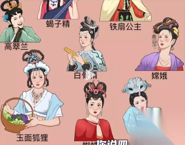 3、拿着琵琶的是蝎子精。 4、张着两个爪子的是玉鼠精。 5、穿着乳黄色披风的是铁扇公主。 6、穿黄色孔雀服的是孔雀精。 7、穿着红色衣服的是万圣公主。 8、手上拿着果篮的是玉面狐狸。 9、手拿黄色棍子的是白骨精。 10、穿着紫色衣服的是嫦娥。 11、最后一个银白色是女儿国王。