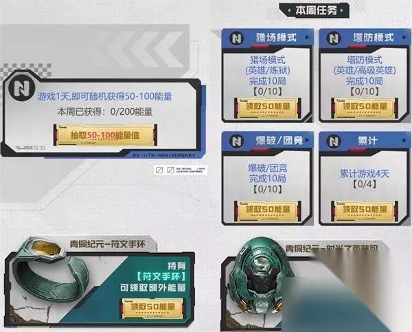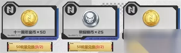 活动还贴心的为时间紧张的玩家准备了全面冲刺任务,8月7日-8月29日没有获取过能量玩家,可以在8月30日-9月17日,完成冲刺任务领取共计200能量,在最后三周也能获取足够的能量,带走所有奖励! 消耗能量兑换周年好礼 在激活机械鲲,带走10000NZ点购物券后,如果各位玩家还剩余多余能量,也可以选择在活动页中,兑换十一周年金币、用于战甲提升的荣耀银币,以及猎场、塔防和竞技道具战备。
