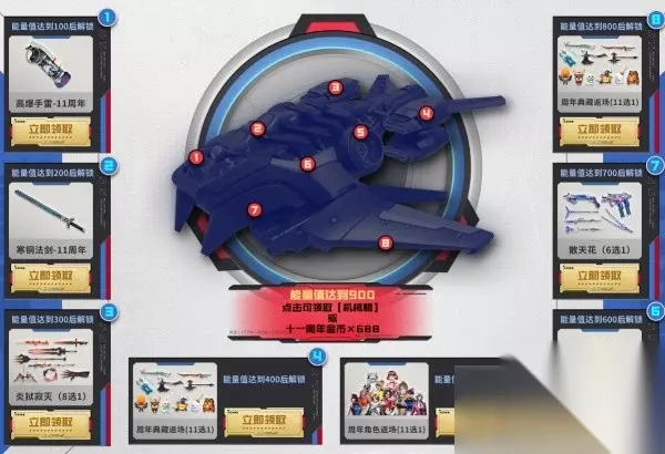 能量值达到100,200和600时,可以领取高爆手雷-11周年、寒铜法剑-11周年以及百鸟朝凤扇-11周年。 能量值达到300,解锁炎狱寂灭8选1; 而达到400、500和800能量值时,可以分别在2次周年典藏返场道具,和1次周年角色返场中11选1。 能量值达到700后,全新的散天花系列武器6选1,直接带回家。