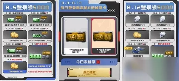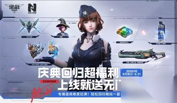 8月5日周六登录游戏即领5000NZ点购物券;8月6日周日游戏1局,还有50枚11周年金币。 8月12日周六登录、8月13日周日游戏1局,同样有5000NZ点购物券和50枚11周年金币等你! 8月6日-8月13日,各位玩家只需满足游戏天数,每天还可以分别领取逆战点购物券、自选道具碎片、11周年金币。 8月7日-8月13日,累计游戏五天,可以免费领取飞升道具革新巨鳍。 在8月3日-8月13日期间,每天登录,还可以抽取最高8倍宝箱掉落卡掉落,助力你早日金光一闪! 激活机械鲲领海量奖励 自从7月开始,11周年全新套装的各个道具已陆续登场,不知各位玩家进度如何? 在11周年最强庆典活动中,飞升道具机械鲲,千万不能错过。 8月7日—9月17日,各位玩家可通过完成任务获取能量值,为机械鲲充能,能量值达到900,即可领取机械鲲,或者688个十一周年金币。