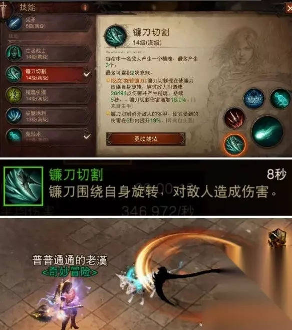 镰刀切割围绕自身旋转,持续5秒, 在维图和增益时间下可以做到8~9秒以上,同时可以让敌人承受的伤害提高19%