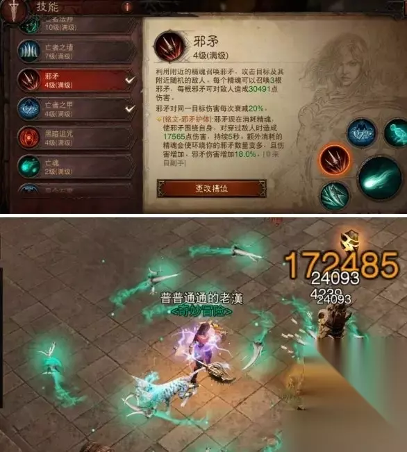 邪矛主要的问题是需要精魂,有更多精魂我们可以召唤更多邪矛环绕自身,从测试来看一共可以环绕达到3圈的上限,并且邪矛数量的增多打出的伤害还会提高,如果地上没有精魂是打不出效果的。