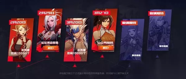 新增10000个激活码获取方式 前往本作的官网并下滑找到体验服的专门预约站,即可看到这次官方筹备的一系列的放码活动的最近动态与计划。其中将在今天开启的放码和之前第一次的2月20号时的一样,都是在能够看到上图的体验服预约页面就能够参与。 如果玩家不太确定自己是否成功取得了资格,可以在同一页面进行查询,已经拥有资格的玩家就不必再凑热闹了。