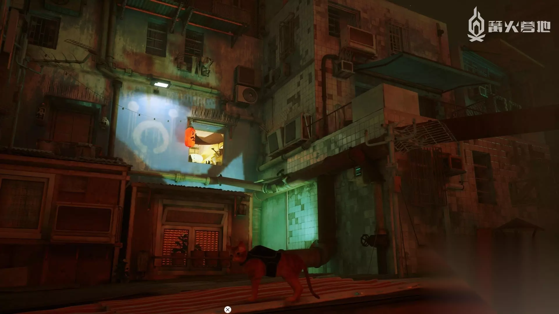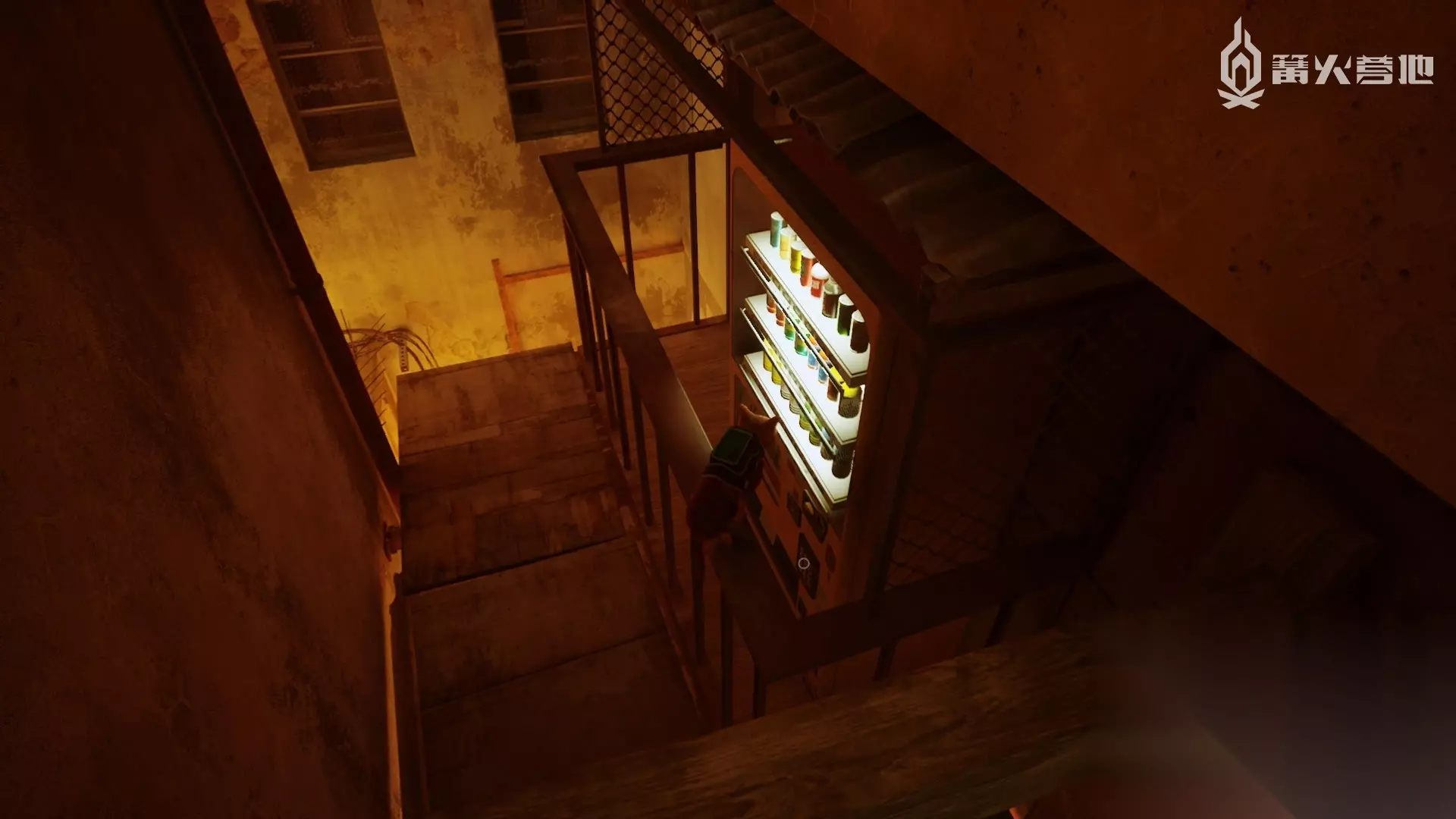 楼顶区域有个坐在椅子上的老人,正对他向左走并向下看,售货机在两栋楼之间的阳台夹着,比较难找到。