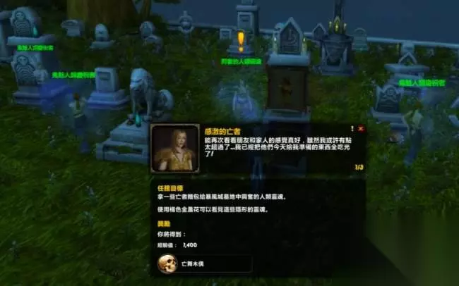 与墓地的亡灵对话可以接受【死者的感激】任务,用悼念糕饼可以换取“死亡木偶”小宠物。悼念糕饼需要玩家用烹饪技能自己制作,没有烹饪技能等级要求,原料只需要NPC出售的冰镇牛奶和面粉。制作悼念糕饼只能用悼念日特有的阴森森的烹饪用火,做出来的食物也只能在悼念日期间食用,并没有什么实际价值。