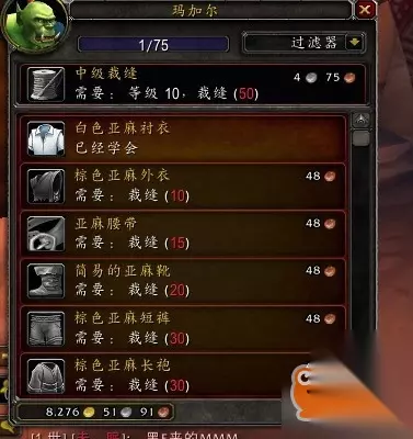 裁缝搭配哪个专业合适 学习裁缝专业的玩家一般会选择附魔来作为第二专业,裁缝制作的很多绿色布甲很少有玩家会购买,而卖商店的话又会觉得很可惜,所以利用附魔专业将这些装备分解成附魔材料是一个不错的选择。 也有很多玩家会选择剥皮来作为第二专业,因为裁缝在制作装备时,特别是做包包时会用到大量的皮革材料,剥皮可以为裁缝提供原材料的补充,这使得玩家不需要花费额外的金钱来购买皮革,也是一个很好的选择。 裁缝怎么玩 第一步 先跟NPC学初级裁缝(1-75)需要:5级 5铜币 (这个每个大城里面都有专门的裁缝师这就不一一介绍了---啥?找不到。问卫兵去) 学习制作亚麻布卷。大概需要制作50个亚麻布卷, 材料:100块亚麻布。(你问做多了?看下去你就知道,) 技能:0 - 40 第二步 跟初级裁缝师学习亚麻腰带。需要制作20个。 材料:20个亚麻布卷,20根粗线。 技能:40 - 60 第三步 跟初级裁缝师学习强化亚麻斗篷。需要制作15个。 材料:30个亚麻布卷,45根粗线。 技能:60 - 75