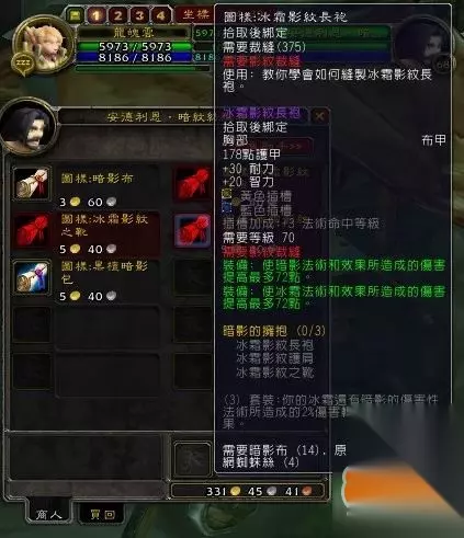 第二十三步 跟沙塔纳城的伊恩学灵纹外套。需要制造5件(这个是个过渡。没办法。最后几点用灵纹布包很难冲) 材料:40张灵纹布卷 10个符文线 技能:345 - 350 到此- 现在你终于可以到沙塔斯城里学各种裁缝分支,学你喜欢的裁缝专精洗布去吧