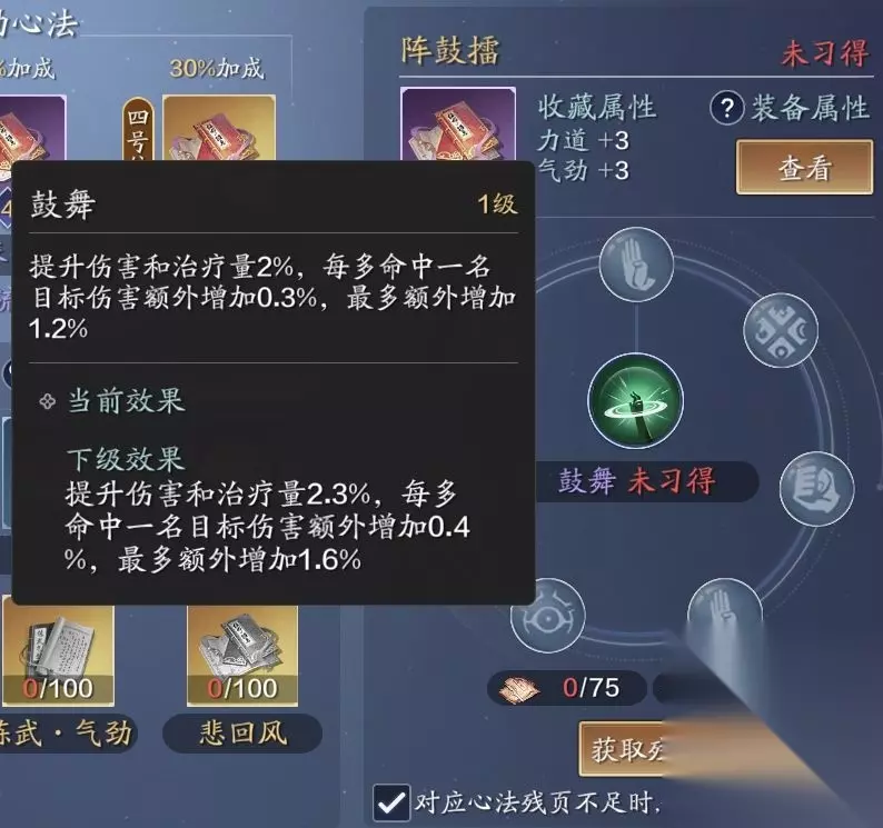 淬火·流毒也是主动心法上的优秀选择,但淬火·流毒延长目标翻滚调息时间和造成减速与持续伤害的效果更多用于论剑场上的PVP对决。在心法的优先级层面,则要弱于风华·玉碎。 被动心法上,啄流云和阵鼓擂都是非常适合的选择,心法效果上都有提升伤害能力的加成收益。唯一不同的是啄流云可对霸体目标造成额外伤害,适用于各种对战环境,而阵鼓擂则更适合帮派联赛和松林问战、瀚海乱斗这种群战模式玩法。所以在心法的优先级上,啄流云要优于阵鼓擂。 在被动心法的选择上,啄流云和阵鼓擂作为当前阶段必备的两本心法。最后一本的心法选择上,我们就可以做更多考虑了。相菩提是最优先推荐的心法,优秀的降低伤害效果非常适合真武远近结合的输出套路。其次则是唤春住,摆摊价格上低于相菩提且同样拥有减伤效果。另外就是在一些特殊环境中,帮派联赛使用旌旗展强化其收割残局的能力,刷本使用破空明加速通关进程。