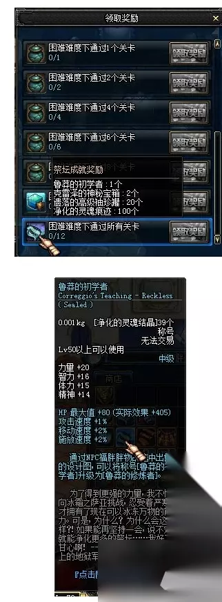 每完成一定的关卡后,可以在守护者祭坛的地图选择界面中点击领取奖励,领取里程碑奖励 里程碑奖励中包括净化的灵魂痕迹,克雷泽的传世宝箱等物品,通关所有12层hard难度的关卡 还可以获得克雷泽的神秘宝箱和鲁莽的初学者称号