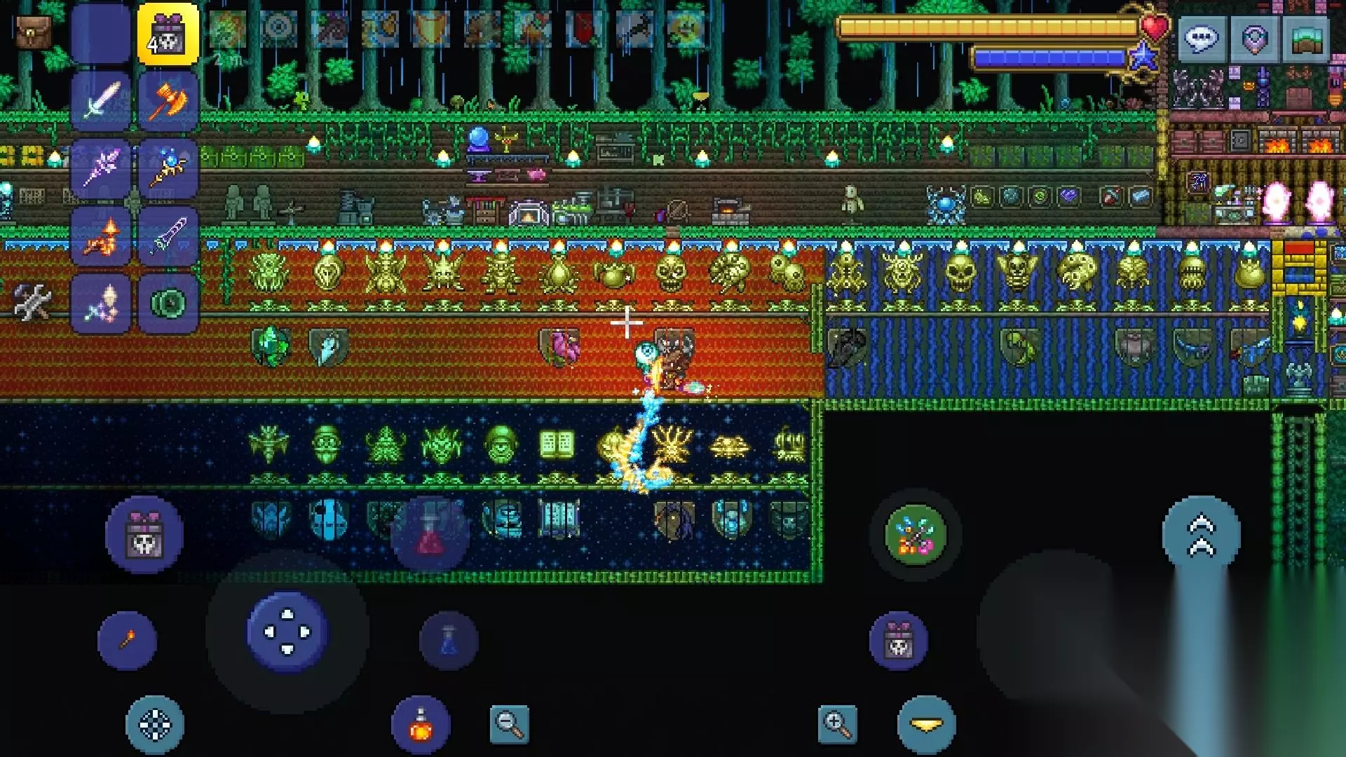 今天在丛林睡了俩小时的觉终于刷出来种子剑合出来天顶了萌新第一次的神器 目前游戏中带血条的总共29个boss,但有一个是在常规图召唤不出来的机械美杜莎,该boss仅在Everything Seed种子地图出现且没有单独的圣杯掉落物。 肉前总共8个boss,肉后包括10个事件boss和10个标准boss。 标准boss:史莱姆女皇,机械魔眼,毁灭者,机械骷髅王,世纪之花,石巨人,猪龙鲨公爵,光之女皇,拜月教主,月亮领主。 10个事件boss:荷兰海盗船,火星飞碟,哀木,南瓜王,黑暗魔法师,食人魔,双足飞龙,圣诞坦克,圣诞树,冰雪女王。 个人推荐顺序:海盗船(出现于海盗事件中)→毁灭者→机械魔眼→机械骷髅王→世纪之花→哀木(出现于南瓜月事件中)→石巨人→火星飞碟(出现于外星入侵事件中)→食人魔(出现于撒旦军队事件中)→拜月教主→月总。 剩余未提到的所有boss均建议月后打。 肉山初期怪物属性大幅度提升,但有刷怪场后可以轻易的处理一些地区的怪物。建议优先刷沙漠设计好战斗场地刷黑暗碎块合成玛瑙爆破枪,初期很实用的武器。在海洋环境中建立好刷怪场后可以用海盗地图召唤海盗入侵,在海洋环境中击杀海盗可以继续获得海盗地图重复刷事件,既可以刷钱也可以刷齐所需要的贪婪戒指(主要经济来源)和荷兰弟飞船,作为第一个无限飞行坐骑有必要早些入手,后期探索建造刷怪都非常有用。 有荷兰弟飞船后利用地下神圣环境刷怪场收集光明之魂,材料足够后在地表宽阔环境中可以合成光明钥匙刷神圣宝箱拿代弓,腐化宝箱怪中腐香囊可以刷几个备用,猩红宝箱怪中夺命杖有一定价值。 拿到代弓后搭建环境,在地表220格高的位置建造蜂蜜池和防激光的密闭环境,场景心灯篝火沙漠雕像(打蜂王的配置)通过配饰和各种buff调整到60+防御以提高存活率,利用代弓和圣箭即可简单的刷毁灭者。 多次击杀毁灭者后可以凑齐神圣套装大幅度提升肉后生存率。 同时毁灭者可以直接升级巨兽鲨,用巨兽鲨+脓血弹打机械魔眼和机械骷髅王要效率很多,战斗场景建议在矿车轨道上,拉扯距离躲避伤害会降低很多难度。 有荷兰弟飞船去打世纪之花会很简单,清空一片足够大的空间后一直绕着花脑袋转即可,自行调整地下丛林环境的范围,越大越有利于打世纪之花,千万要注意环境范围一旦拉扯过界(尤其是飞的较高)时候世纪之花狂暴后会难以应对。建议武器巨兽鲨+脓血弹(一阶段)巨兽鲨+水晶弹(二阶段) 打过世纪之花后地牢升级可以获得灵气,大量武器和一些必要配饰。圣骑士锤可作为泰拉刃的临时替代品,圣骑士盾用于合成冰冻盾和英雄盾,狙击镜可以合成射手必要的两镜,该时间也可以合成十字章护盾。晨星和狙击枪都可以作为升级武器使用。 灵气,南瓜,神圣锭可以用于合成南瓜勋章用于召唤南瓜月,该事件难度较高建议多刷哀木,南瓜王并不着急刷也不需要打太多波次,女巫扫帚是永久飞行坐骑的最泛用的一把,三格高能进门最高46/41速灵活程度已经足够,召唤玩家可以刷出草莎纸升级配饰,以及阴森木召唤套装(廉价到无法想象!)。 石巨人需要多加练习走位躲开激光,可以选择继续用女巫扫帚全场走位也可以选择另一个南瓜月掉落的坐骑魔法树枝,该坐骑可以提供游戏中坐骑最高的水平移动速度和移动加速度,但需要手动搭建平台。 外星母舰伤害极高但背板住攻击顺序后伤害都很好躲,击杀并不困难。外星人法杖是很实用的一把召唤武器,电圈发射器在合适环境也可使用。 食人魔可打可不打,掉落的哨兵上限+1配饰对召唤师很重要,对别的职业提升不大。 打拜月教主和月亮领主之前套装并不重要对于非召唤系角色神圣套装够用,饰品需要尽量提升。 战士:三盾(十字章护盾,英雄护盾,冰冻护盾)两脑(克苏鲁之脑,蠕虫围巾)两血(再生手环,神话护身符)两手(狂战士手套,烈火手套)和悠悠球袋中挑选搭配。 法师:法师那抠搜的配饰…包括三徽章随便搭吧 射手:玩弓两袋两镜三徽章,玩枪两镜三章克脑忍者大师套装。 召唤:甲虫草莎纸,矮人项链,食人魔配饰(四种掉落效果相同且不可叠加,随便选个顺眼的),三徽章,熔火拳套。 以上是推荐配饰可根据自身情况任意调整。 拜月教主多练习走位熟练切换武器可以很轻松击杀,后续的四天柱小怪难度比教主还高Orz 月亮领主利用飞行坐骑拉扯和背板躲激光,多加练习走位,只要优先打掉额头上的激光眼后续难度就低很多。 打过月亮领主后建议优先合成耀光套装可以站撸月总降低操作量,方便刷月总武器。 站撸月总 - TapTap 个人的一个配置没有心雕像和别的东西提供一个可行性,有心雕像的话月前就可以研究站撸月总。 关于其他boss: 史莱姆女皇:没太多有用的道具,如果想提前打建议在神圣环境倒水创造一层水平台,这时会使召唤的远程小怪处于漂浮状态而无法攻击,大幅度降低走位难度。 猪龙鱼公爵:愿意的话跟大佬学学矿车逃课,如果凭走位则要坐骑和翅膀不断切换,或者不断改变走位方向即可躲开冲击。 光之女皇:月前打白光难度极高唯一收获是泰拉棱镜,风险收益不成正比。 夜光刷一刷拿到万花筒也不错,毕竟是召唤师最强鞭子。 霜月召唤的圣诞节boss没有好东西难度还特别高,月前打就是在找虐,但要是有特殊需求比如说创造红心池也可以考虑刷一下低波次。