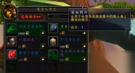 首先说说染血铸币的来源: 最官方的来源是使用1000个“永恒铸币”在这个NPC商店里买第一样东西:不灭苦痛香炉,使用后会变身为一个红色的斗士,此时敌我不分,无论是联盟玩家还是部落玩家,只要是开了PVP你都可以击杀,同理,无论联盟还是部落都能杀你,你每在红色斗士状态下杀死一个人就会获得一个“染血铸币”,而被你杀死的玩家会被烙印上debuff,十分钟之内被杀不会再掉落染血铸币: