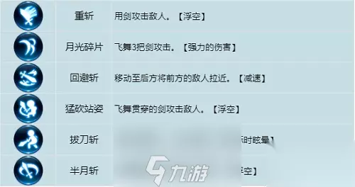 “重斩”是一个非常基础的技能,非常实惠,新手时期可以养。 “回避斩”能够控制敌人,还带减速效果,值得养。 “月光碎片”和“拔刀斩”伤害力都较高,可以选养一个。 “半月斩”攻击范围大,攻击力高,非常适合用于打副本。 2.连续技