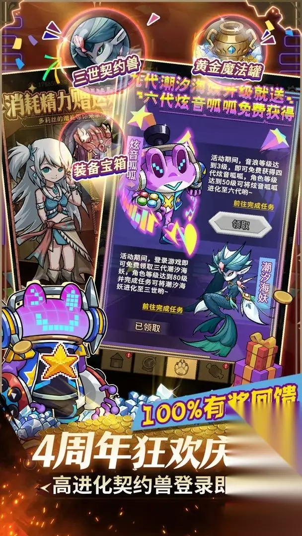 新增活动 1.新增“4周年庆典登录”活动 - 活动时间:3月27日-4月24日 - 活动介绍:上线即可领取8888钻石和4周年纪念称号,每日登录领取黄金魔法罐等奖励 - 活动奖励:8888钻石、神话魔法罐、时空裂隙邀请函等 2.新增“音浪来袭”活动 - 活动时间:3月27日-4月24日 - 活动介绍:登录即可领三代潮汐海妖,完成音浪升级挑战最高可进化到三世;音浪等级到达3级即可免费领取4代钻石契约兽炫音呱呱,可免费进化到六代 - 活动奖励:炫音呱呱、潮汐海妖、中级技能书袋子等 3.新增“庆典大转盘”活动 - 活动时间:3月27日-4月3日 - 活动奖励:三世仙彩鹿,代金券,12星装备升星券等 4.新增“限时挑战”活动 - 活动时间:3月27日-4月24日 - 活动介绍:参与挑战世界BOSS、MVP挑战赛、汐龙本源副本,完成限时任务,赢取精美道具好礼 - 活动奖励:橙色纹章宝箱、汐龙结晶、神话装备碎片等 5.新增“恶魔之眼首杀、竞速挑战”活动 - 活动时间:3月27日-5月8日 - 活动介绍:迎战恶魔之眼,参与恶魔之眼首杀竞速活动,登上排名获取荣耀奖励 - 活动奖励:限定头衔、神话魔法罐、恩佐的秘传锻具等 6.新增“汐龙本源首杀、竞速挑战”活动 - 活动时间:3月27日-5月8日 - 活动介绍:向更强者终极古神翼发起挑战,跨区首个通关汐龙本源队伍可登上本源首杀王座,获取限定头衔;限时通关汐龙本源,可获取竞速挑战奖励 - 活动奖励:限定头衔、六代神话自选罐、六代钻石自选礼盒等 7.新增“深渊冒险巴士”活动 - 活动时间:3月27日-5月29日 - 活动介绍:活动期间内完成相应的渊界地下城任务,即可领取丰厚道具奖励 - 活动奖励:钻石、随机传说装备箱子等 8.新增“消耗精力赠送好礼”活动 - 活动时间:3月27日-4月24日 - 活动介绍:每日消耗精力,即可获得收获礼盒,打开有机会获得橙装随机宝箱等好礼 - 活动奖励:收获礼盒、火星石、纹章经验等 9.新增“全服升星狂欢”活动 - 活动时间:3月27日-4月24日 - 活动介绍:本服的每次升星均可累计升星进度,达到相应升星次数可解锁升星折扣,助力全服升星狂欢 10.商城新增“焰蛇典藏装扮礼盒” - 活动时间:3月27日-6月26日 - 内容介绍:双职业焰蛇典藏装扮正式上架,内含华丽时装、炫酷光环,更有光环技能赋予器、蘑菇精力源泉等稀有道具,全新可染色炫酷时装,光环技能赋予器可附加新强力属性 11.新增“回归福利”活动 - 活动介绍:未登录游戏大于30天(含30天)的角色会成为回归角色,触发福利活动;享受专属回归福利,完成挑战任务后可获得奖励 12.新增“宝宝逃学记”、”哥布林通缉“、“黄金花园双倍up”、“怪蛋岛双倍up”、“契约兽派对”周常活动 13.新增“升级送好礼”、“罗德夫投资”成长活动 14.“首充送嘟比”活动调整 - 活动说明:重置首充送嘟比活动,原嘟比不再产出,替换为炫彩嘟比(炫彩嘟比可回血回蓝和提供护盾),活动赠送的嘟比进化礼盒调整为炫彩嘟比进化礼盒,精制套装宝箱调整为2星精制套装宝箱 15.”闪光魔盒“优化 - 道具说明:闪光魔盒开启移动至商城常驻界面,直接消耗闪光锤开启获取奖励;移除闪光魔盒道具,已有的闪光魔盒会转换成金币后通过邮件发放 16.新增“要塞通行证”活动 17.新增“4周年纪念礼盒”、“新手助力礼包”、“神话尊享礼盒”、“限时冲星好礼”、“闪光锤限时特惠礼包”、“多买就送-团本助力”活动 18.商城新增道具“改名卡”、“每日特惠礼包”、“每周促销礼包”