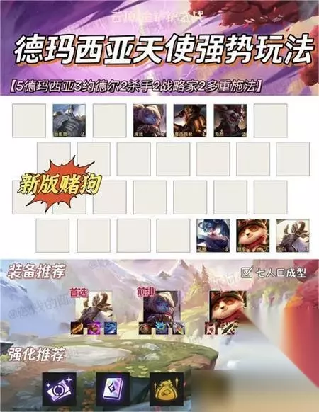 英雄强化: 德玛转/弈士利器/精英耐久/升级咯/后期专家/多多益善/果决/主打陪伴 英雄之力: 龙王,拿升级类、德玛转职能直接跳9最佳 这就是《云顶之弈》S9德玛西亚阵容玩法的详细内容了,玩家可以根据攻略多多尝试,找到适合自己的解决方法来完成通关。