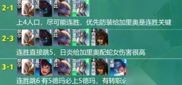 羁绊: 4神谕、4法师、3电1、2壁垒、2巨神 运营思路: 2-1上4人口,防装给加里奥; 2-3连胜升5人口,日炎给加里奥; 3-1连胜升6人口,有5德玛西亚羁绊必上,有转职可做;