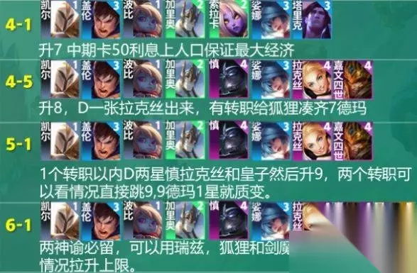 4-1升7人口,卡50利息保经济; 4-5升8人口,D出拉克丝,有转职纹章给阿狸凑7德玛西亚羁绊; 5-1,D出两星拉克丝、慎和皇子,然后升9人口; 6-1,留2神谕羁绊,可以用瑞兹,阿狸和剑魔可以看转职和2星升上限。