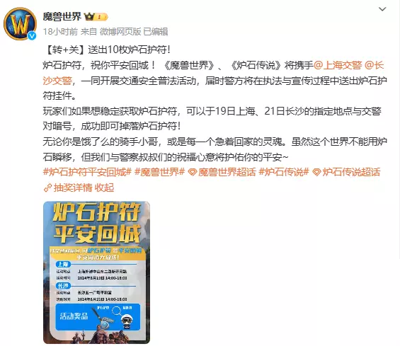 2、魔兽世界、炉石传说携手上海和长沙交警,一同开展交通安全普法活动。 内容:在8月19日和8月21日可以在上海和长沙的指定地点和交警对暗号,成功就可以获得炉石护符。