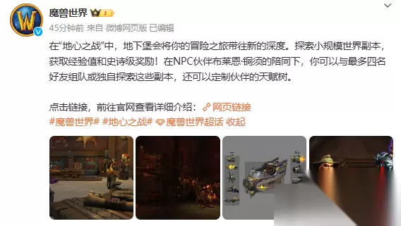 2024年8月19日 1、新模式地下堡介绍 内容:带来了最新的11.0版本中新的小规模的世界副本的介绍,带来了全新的游戏玩法,获取各种类型的奖励,和好友组队或是独自探索,进行属于你的冒险。