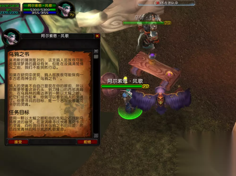 “莫希斯·轻翼”走到这一步时,就会让玩家前往刀锋山的常青林,在那儿找“风歌”接《乌鸦之书》的任务。玩家接到这个任务后,得去刀锋山的奥格瑞拉营地打以太鳐,以太鳐之眼的掉率是100%,拿到眼睛后合成道具,然后再到奥格瑞拉营地门口找鸦人NPC交任务。