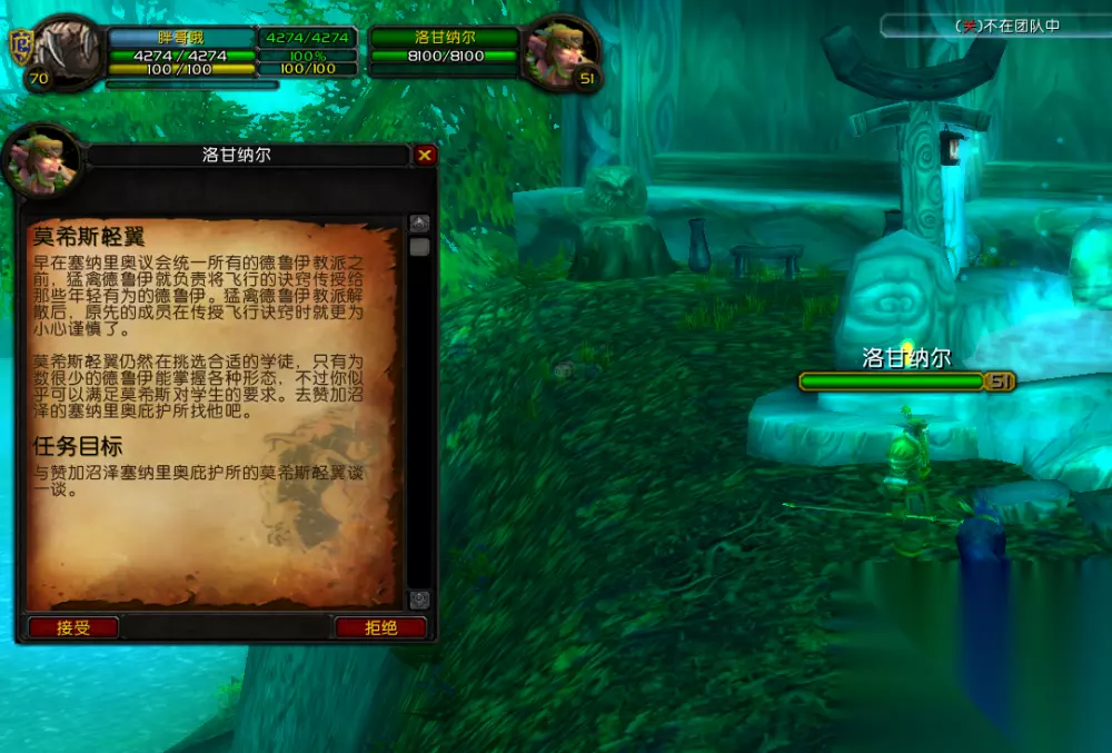 在完成采集任务后,“莫希斯·轻翼”会让玩家前往月光林地唤醒沉睡者。玩家可以直接用技能回去,到月光林地右下角的怒风兽穴找到相应的NPC,就能接到保护任务,等这个任务完成后再返回赞加沼泽。