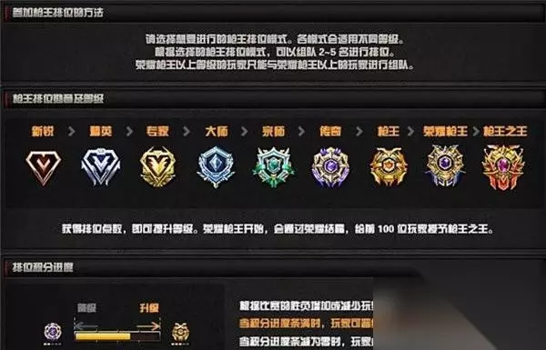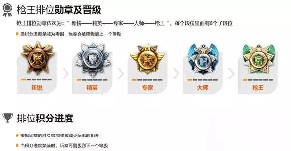 3、枪王排位徽章:新势力——精锐——权威专家——高手——枪神。每一个段位里有6身高段位。 当积分兑换时间轴减为零时,游戏玩家能被降权到上一个级别。 排位赛积分兑换进展: 依据竞赛输赢提升或减少游戏玩家积分兑换。 当积分兑换时间轴满时,游戏玩家可晋升至下一个级别。