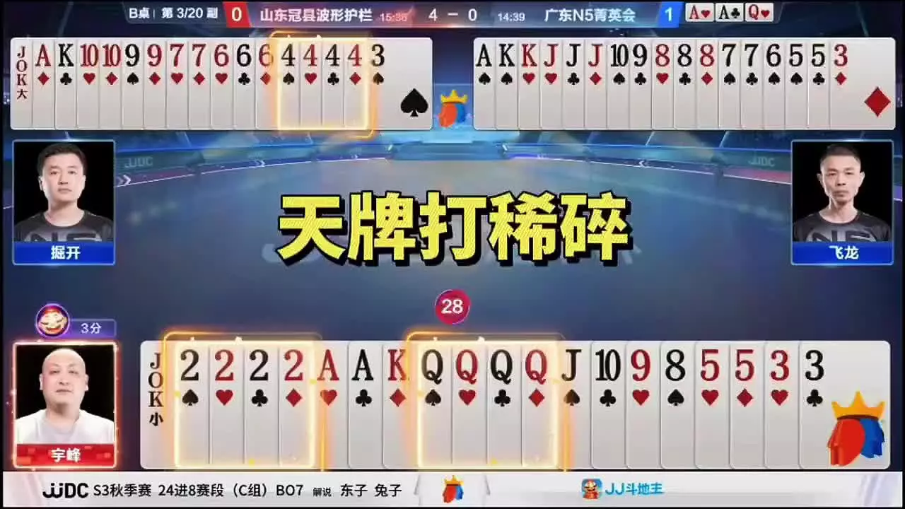 这是JJ斗地主冠军杯的赛事对局,展示了选手出牌的精彩过程,能从中学习JJ斗地主技巧,比如单牌应对、牌型规划等打牌思路。