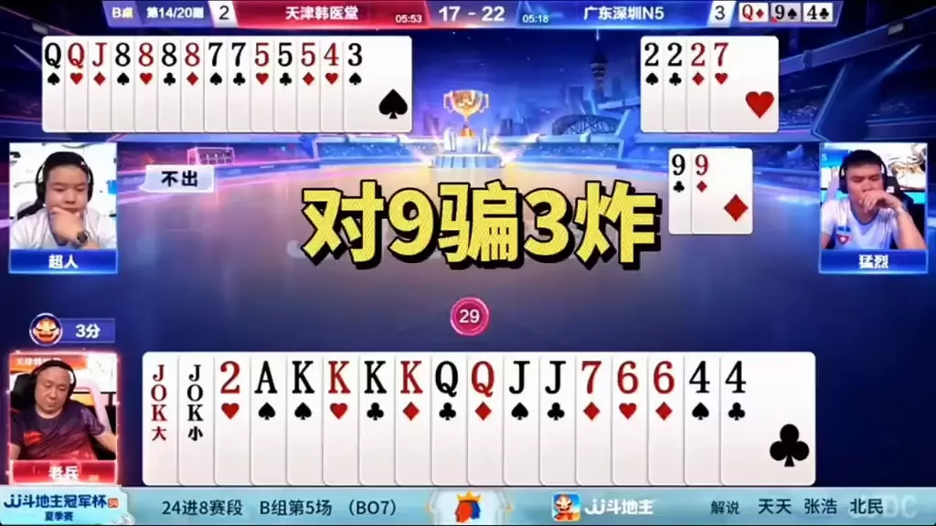 三岁玩牌破釜沉舟四个3的大胆一炸后期残局细腻的行牌为自己争取到了胜利!