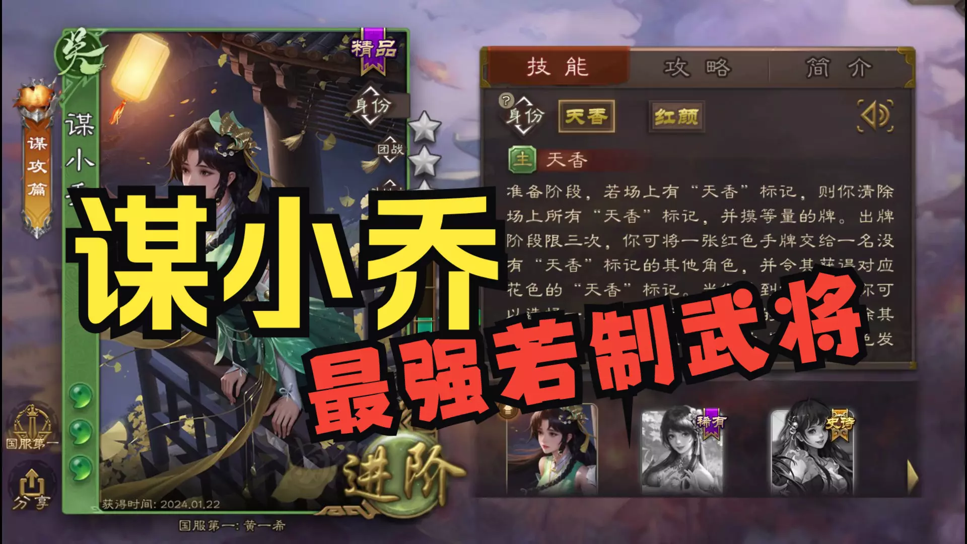 这是一则三国杀武将白话教学,讲解谋小乔的技能玩法,展示了其在排位中使用天香转移伤害、利用红颜特性等实战操作,说明谋小乔是排位里非常棘手的武将。