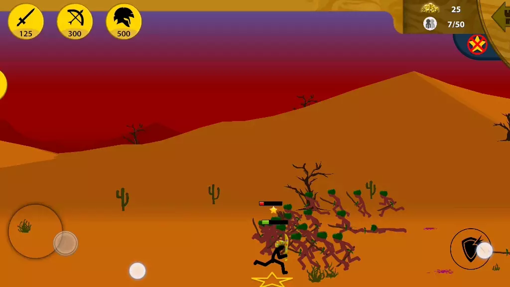 这是策略游戏《火柴人战争遗产》的自编剧情“伏击”内容,展示了沙漠场景里的战斗过程,玩家可点击按钮命令单位驻守,还会遭遇敌人的精英战士,需操控火柴人单位展开攻防战斗。