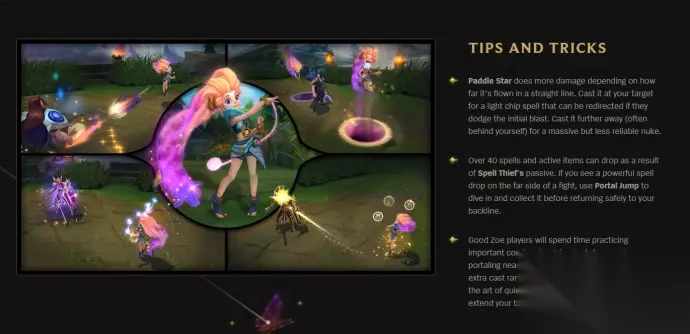 P 更加閃亮 每次使用技能,將增加下次普攻傷害 Q 擊星 射出一顆流星,擊中目標造成範圍傷害 傷害會隨移動距離提升、且發射後能改變一次飛行方向 W 技能小偷 敵人使用招喚師技能或主動道具後,會留下技能碎片 佐伊能撿起並使用他們 佐伊使用任何招喚師技能後,會增加跑速、並有三發導彈攻擊最近的敵人 E 睡眠泡泡 射出一個泡泡,對第一個擊中的敵人附加入睡效果 短時間後敵人會入睡、且會受到下個攻擊更多的傷害 如果泡泡沒有擊中,會變成陷阱停留一小段時間 R 傳送跳躍 佐伊往前傳送一段距離、並再傳回來 期間能使用技能或攻擊、但無法自己移動 皮肤