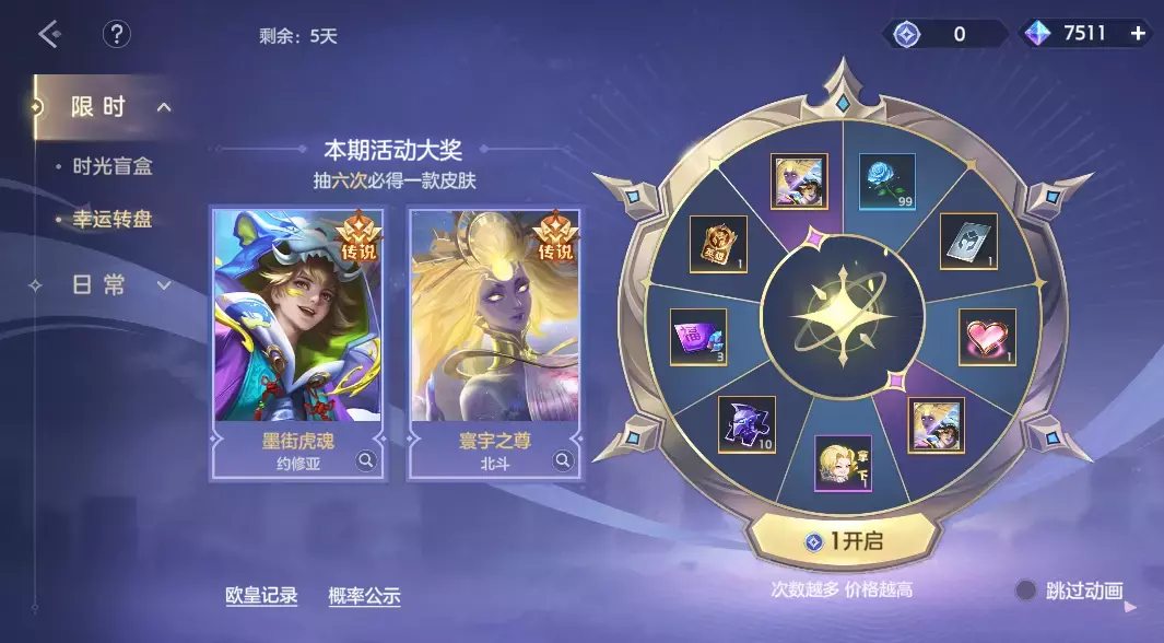 使用龙晶或完成任务获取幸运币,进行抽奖。约修亚·墨街虎魂、北斗·寰宇之尊、幸运星英雄自选箱、拿下表情、龙魂祈福卡、皮肤碎片、改名卡等奖励等你来抽!最多6抽获得1款皮肤,最多9抽可获得全部奖励,前2抽抽到皮肤的守护者会获得欧皇称号。