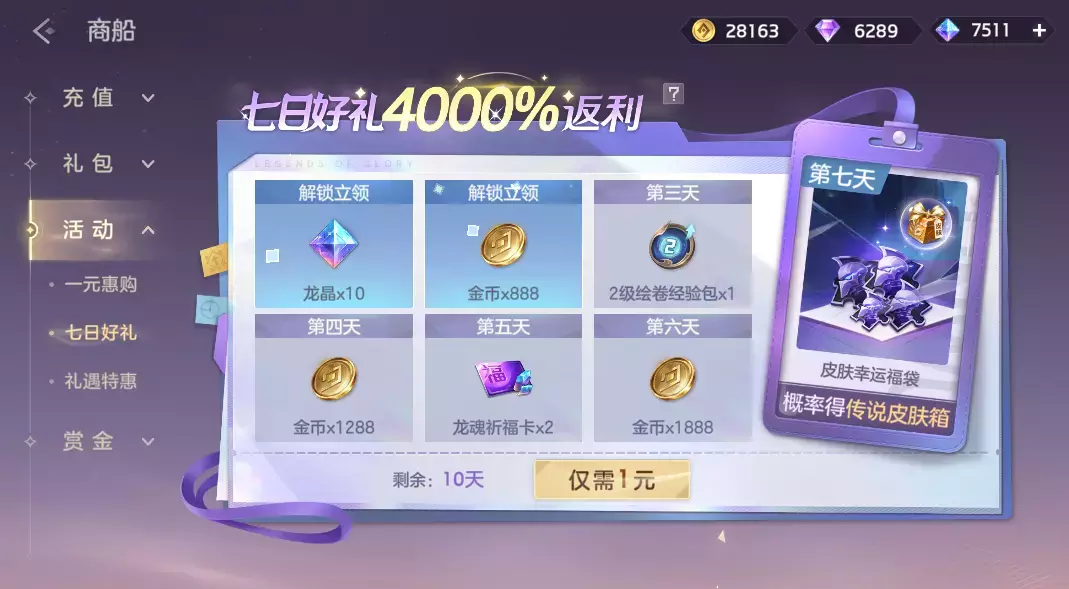 付费1元解锁登录活动,登录即可获得龙晶*10、龙魂祈福卡、2级绘卷经验包等奖励。累计登录7天必得皮肤碎片*10,概率额外获得传说皮肤自选箱!