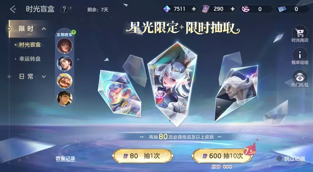 参与时光盲盒抽奖,即可获得头像框自选箱、星光皮肤体验卡自选、钻石祈福卡、英雄碎片。