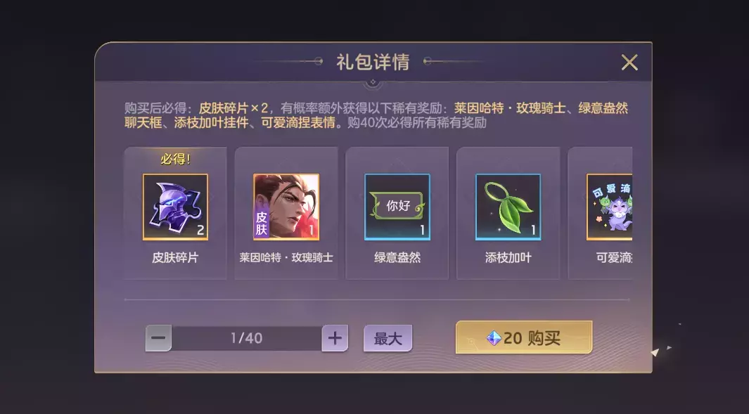 玫瑰礼盒限时开售,每抽必得皮肤碎片*2,更有稀有奖励莱因哈特·玫瑰骑士、绿意盎然聊天框、添枝加叶挂件、可爱滴捏表情等你来抽!最多40抽可获得全部稀有奖励。