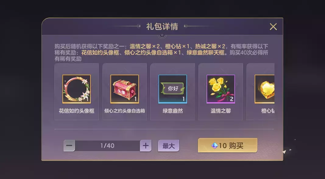 花嫁福袋限时开售,购买后可随机获得温情之馨*2、橙心钻*1、热诚之馨*2,概率获得稀有奖励花信如约头像框、倾心之约头像自选箱、绿意盎然聊天框,购买40次必得所有稀有奖励。