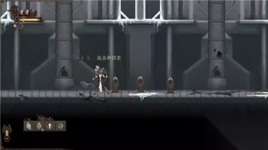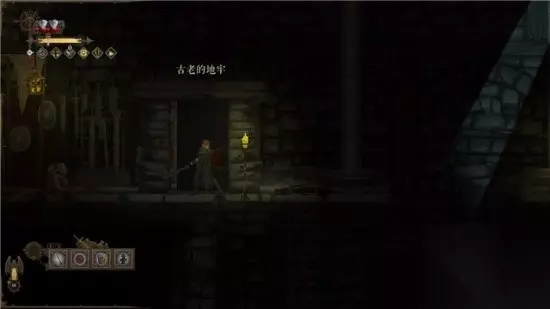 接着继续往右走,各种教程出现。 首先你可以使用短剑+盾牌和弓+箭两种武器组合。 使用前者的话,可以进行近战攻击和格挡。 使用后者则需要使用蓄力射击,并且箭矢的数量是有限的。