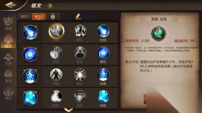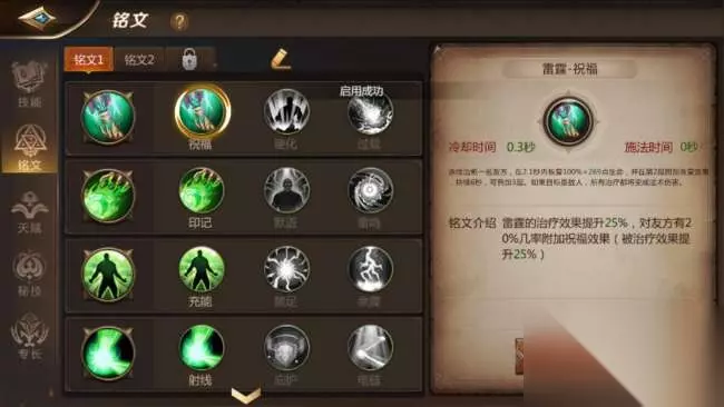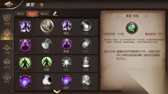 到了35级天赋技能时,这个就可以十分灵活来选,如果是纯加血【禁咒】,可以点满第一个元素之灵,来增加自己的韧性与移动速度。如果偏向【巫祝】流,可以点满第二个秘语,用于大幅度减少秘技的冷却时间,提升用奶量。 45级天赋技能选择,【巫祝】流,选择巫医大师点满。【禁咒】选择坚固硬化。 铭文 作为有三种流派的职业,铭文也同样有三种加点。这个相比天赋要简单很多,没有特别的硬性规定,全屏个人习惯。