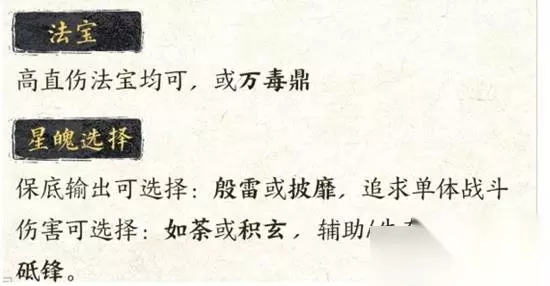 法宝选择: 高直伤法宝: 可以选择具有高直接伤害的法宝,这类法宝通常能提供较强的输出能力。 万毒鼎: 万毒鼎也是一个不错的选择,可能因其特殊的效果或属性而受到推荐。