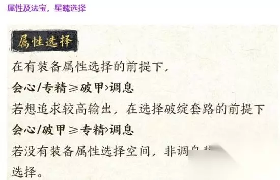 总结: 在游戏中,属性、法宝和星魄的选择对于角色的战斗效率和生存能力至关重要。玩家需要根据自己的战斗风格、角色定位以及当前的游戏进度来做出选择。例如,对于追求高输出的玩家,会心和破甲是重要的属性,而对于更注重生存和辅助的玩家,调息和砥锋星魄可能更加合适。法宝的选择则依赖于其提供的效果是否与角色的技能和战斗风格相匹配。通过合理搭配这些元素,玩家可以最大化角色的潜力,以适应不同的战斗环境和挑战。