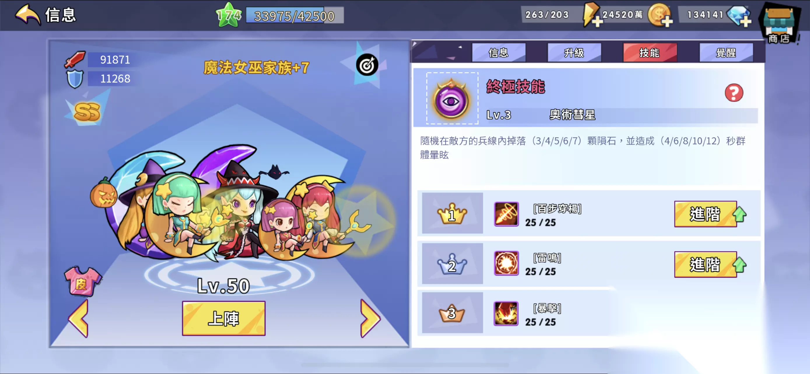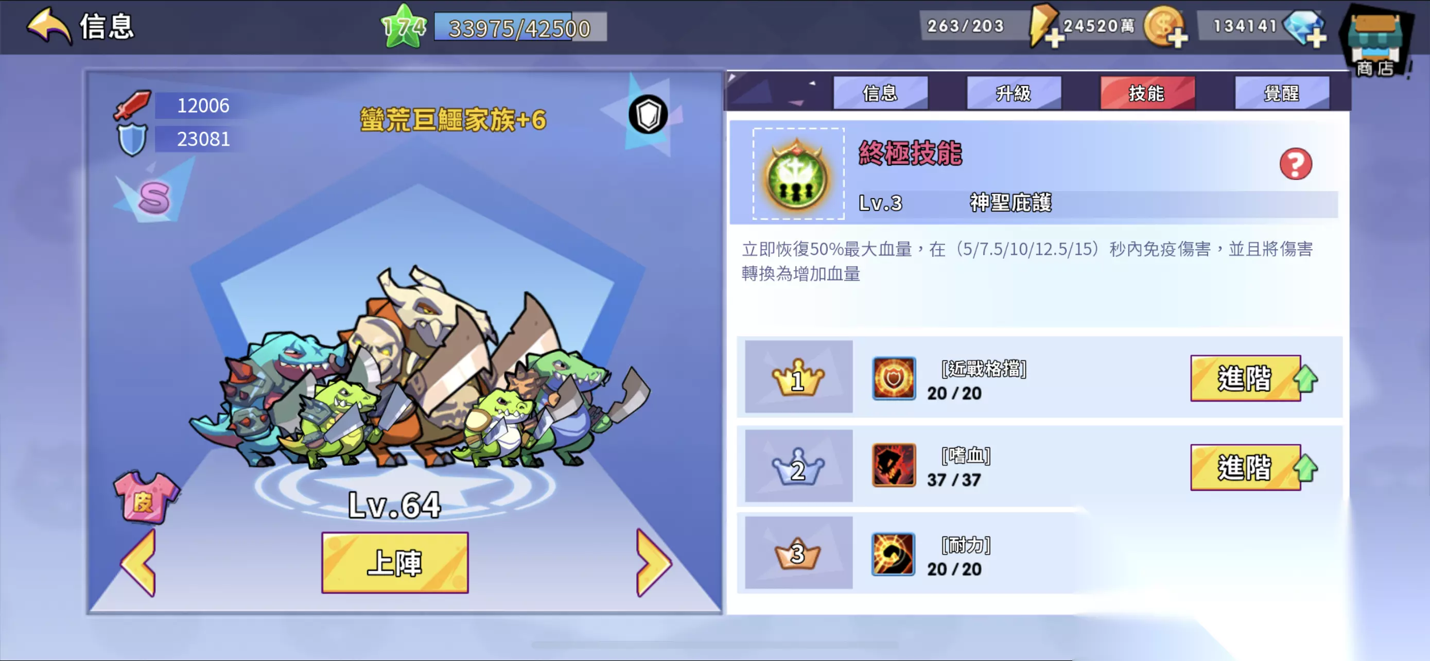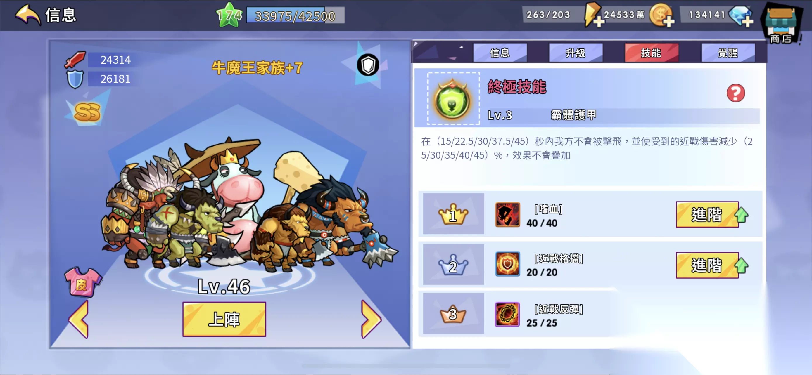 嗜血等级高,初始25级+觉醒20级,如果加上这俩进阶还能多出来10级,同时还有耐力、回避、幸运、伤害加强、成群,打魔王可用。 三是SS牛魔王