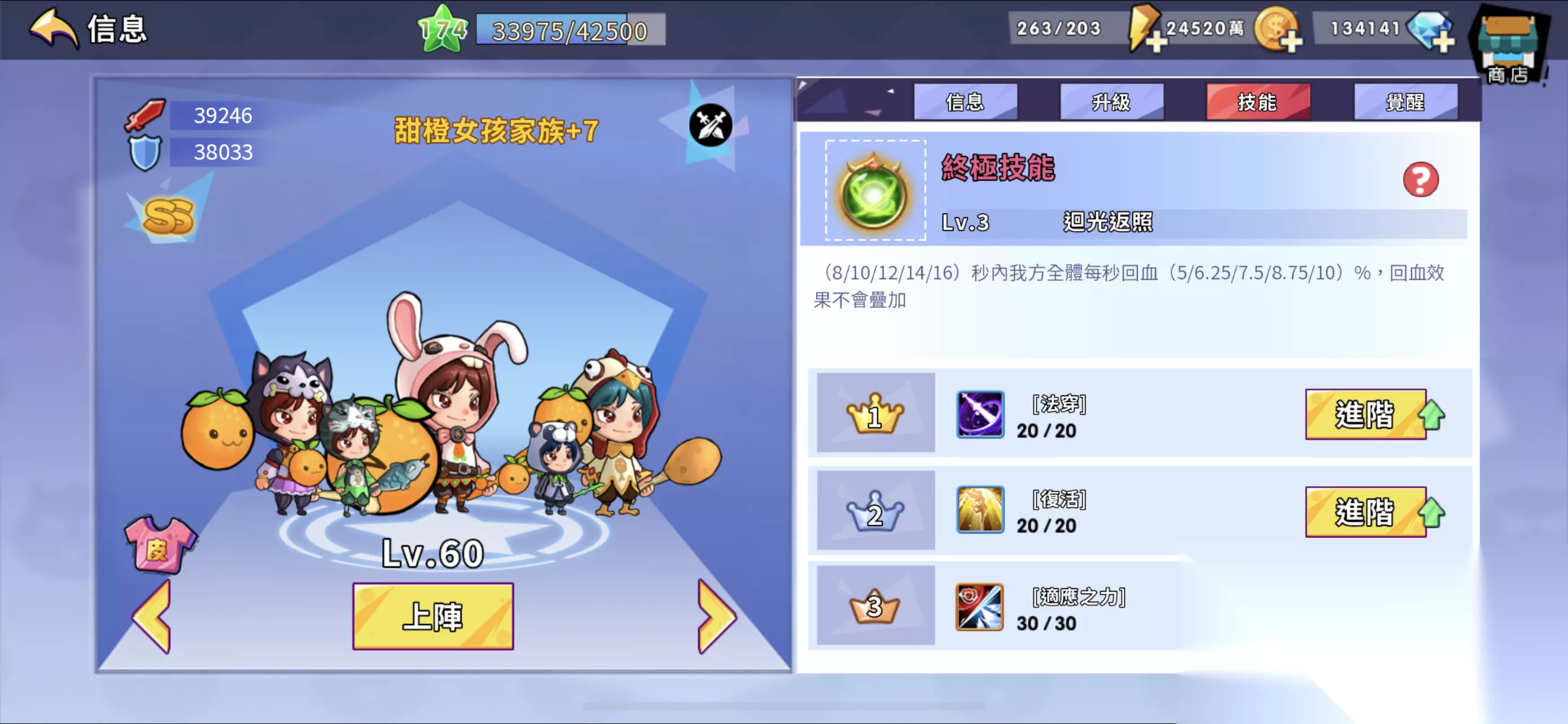 初始20级嗜血+觉醒20级,还有近战格挡、近战反弹、血量加强、伤害加强、召唤小怪,也是打魔王可用,毕竟是SS,46级面板比64级鳄鱼还高一截。 四是SS魔力橙