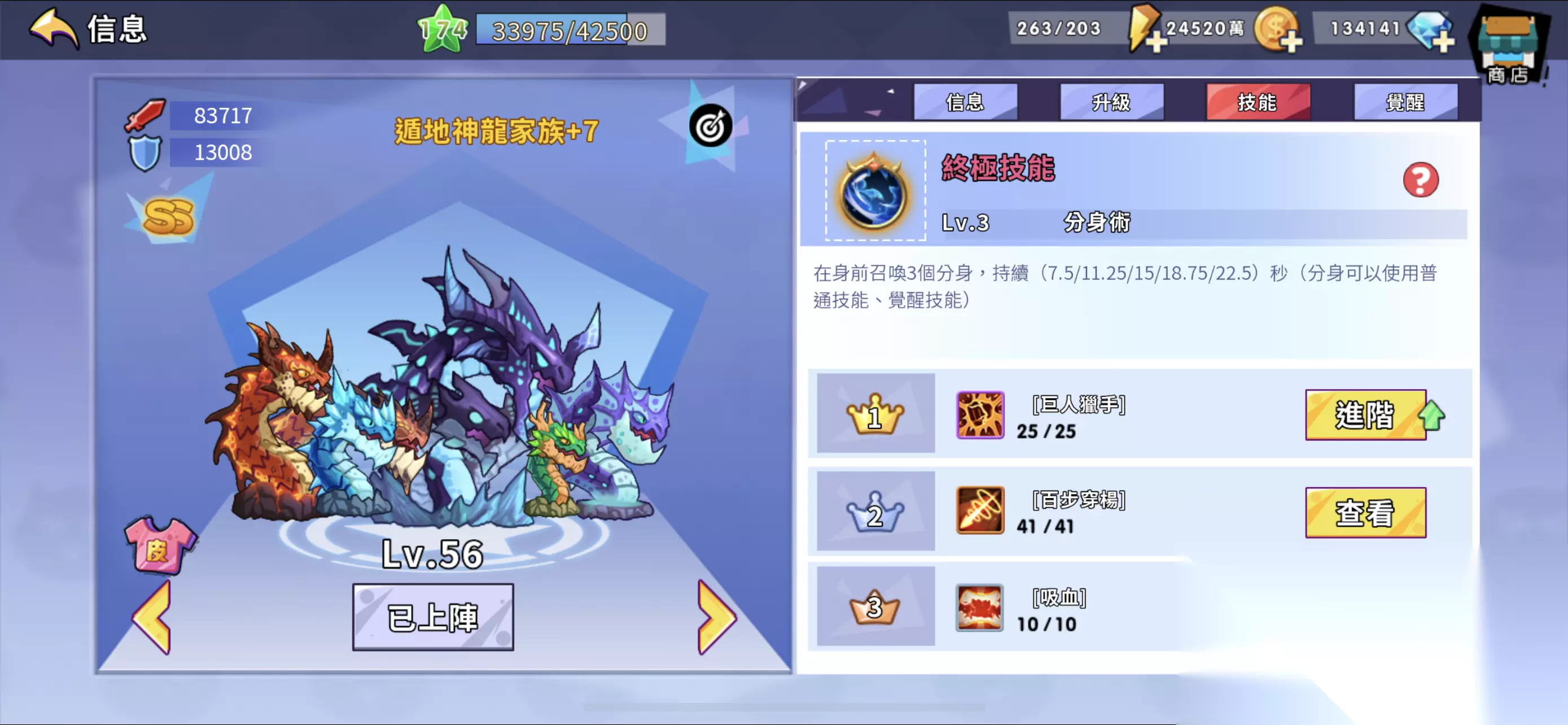 这位更是重量级,推图很一般但是打魔王巨强。初始25级适应之力+觉醒20级嗜血+法穿+复活+幸运,非常适合打魔王,后期必练。 五是SS遁地神龙