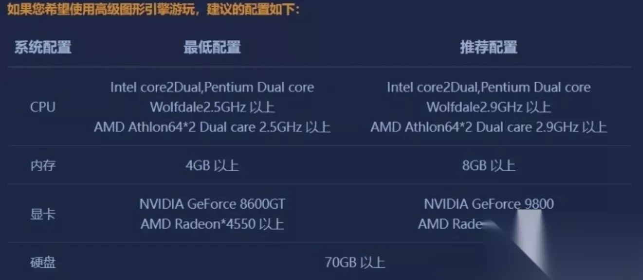推荐理想配置建议选用NVIDIA GeForce 9800或AMD Radeon 4850及以上级别显卡,以支持2K乃至4K分辨率下全特效高画质运行;CPU建议选择AMD Athlon64 X2 Dual Core 2.9GHz或更高级别的多核处理器,确保在大规模团战和AI密集场景中的稳定表现;内存提升至32GB,有助于提升系统缓存效率,配合DirectX 12 Ultimate API,全面释放光线追踪、全局光照等次世代图形技术潜力。