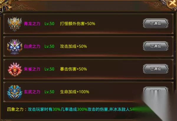 四象之力有什么用 四象之力,分别指:青龙之力、白虎之力、朱雀之力、玄武之力。 四象之力各自加成又不同,组合起来还有额外特殊效果,四象之力位于第四大陆朱紫国,四象之力升级材料可以从地图怪物身上概率掉落,现在来给大家详细介绍一下 【青龙之力】 消耗对应数额的青龙之魂进行升级,升级可以增加打怪额外伤害。最高50级 【白虎之力】 消耗对应数额的白虎之魂进行升级,升级可以增加攻击加成。最高50级 【朱雀之力】 消耗对应数额的朱雀之魂进行升级。升级可以增加暴击伤害。最高50级 【玄武之力】 消耗对应数额的玄武之魂进行升级。升级可以生命加成。最高50级 四象之力每一项对角色属性都很重要,升级四象之力增加属性的同时也会提升角色战力。 组合起来的四象之力附带特殊效果:攻击玩家时有30%几率造成300%的攻击伤害,并冰冻敌人5秒,触发间隔50秒。