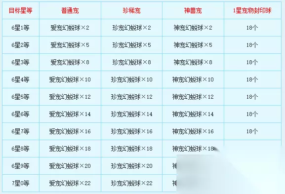 七星合成的消耗数据 以下数据是普通宠、珍稀宠、神兽七星合成所需材料数量表格。