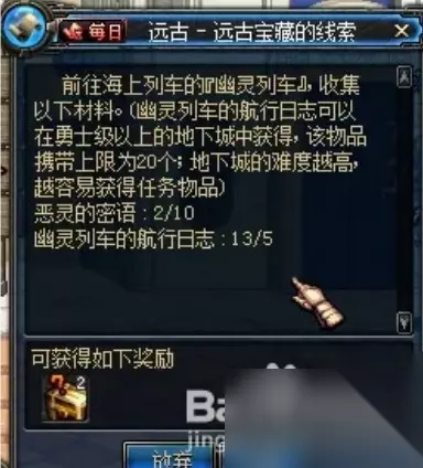 3、寻找远古宝藏的线索任务介绍: 挑战幽灵列车,要求地下城难度在勇士级及以上,收集任务材料——10个恶灵的密语和5个“幽灵列车的航行日志”。集齐之后即可完成任务,获得两个“远古宝藏的线索”。(为力求描述准确性,部分资料来源于官方)