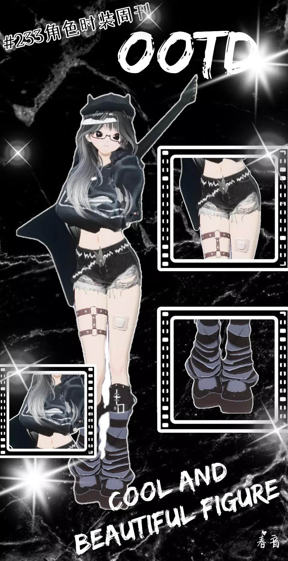 - 配饰:黑色猫耳贝雷帽融合二次元萌感,与酷感形成反差;眼镜增添文艺感;黑色电吉他直接点明摇滚朋克属性。